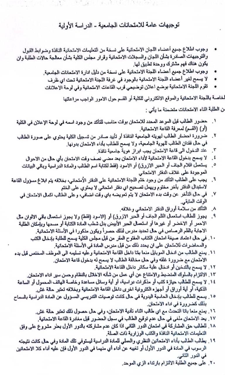 توجيهات عامة للامتحانات الجامعية - الدراسة الاولية