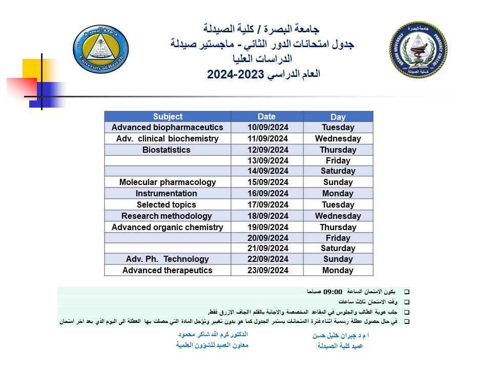 تدعو عمادة كلية الصيدلة في جامعة البصرة كافة المعنيين والمهتمين إلى قراءة ومراجعة تفاصيل المُرفق أدناه بدقة لاحتوائه على تعليمات وتوجيهات هامة.