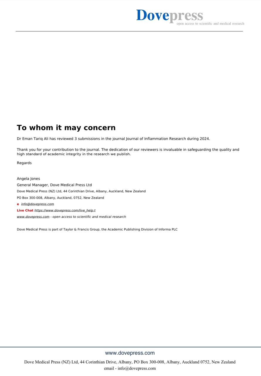 اختيرت التدريسية في كلية الصيدلة بجامعة البصرة، الأستاذ الدكتور إيمان طارق علي الأحمد، مقيماً علمياً معتمداً لمجلة Journal of Inflammation Research الدولية المرموقة.