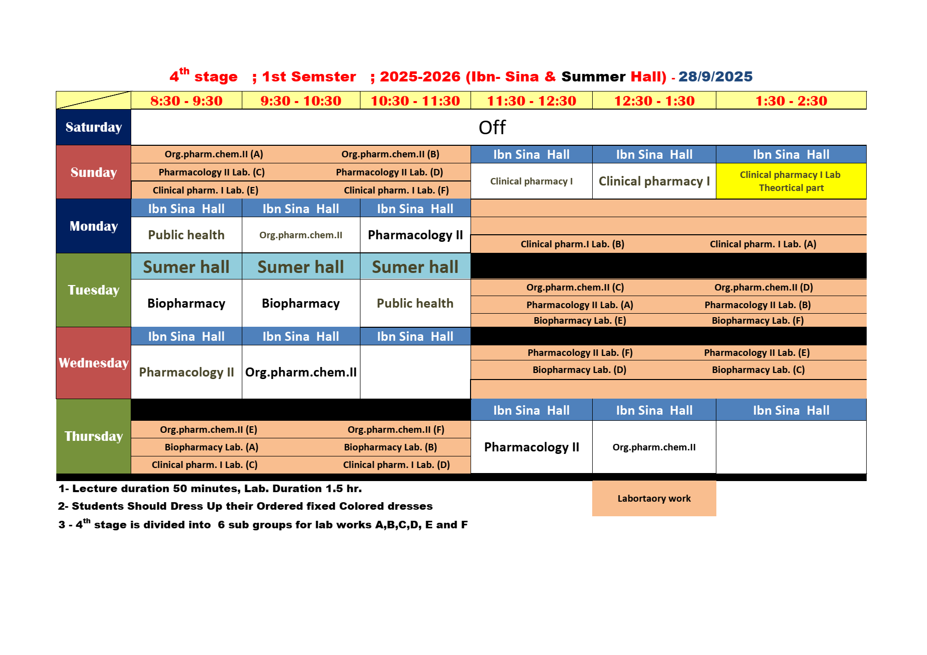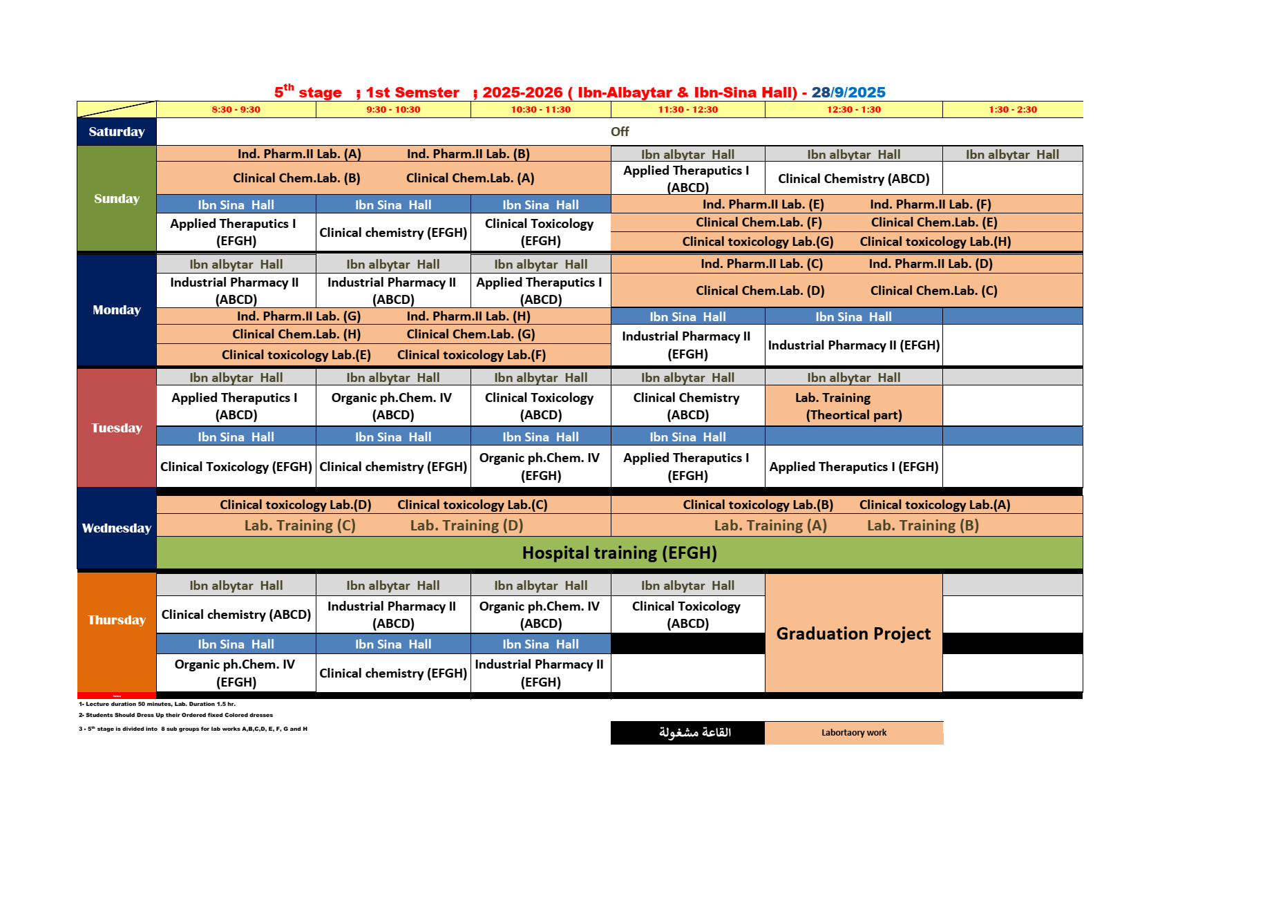 تدعو عمادة كلية الصيدلة طلبتها الأعزاء للاطلاع على الجداول الدراسية الأسبوعية للفصل الدراسي الأول من العام الدراسي الجديد (2025-2026).
